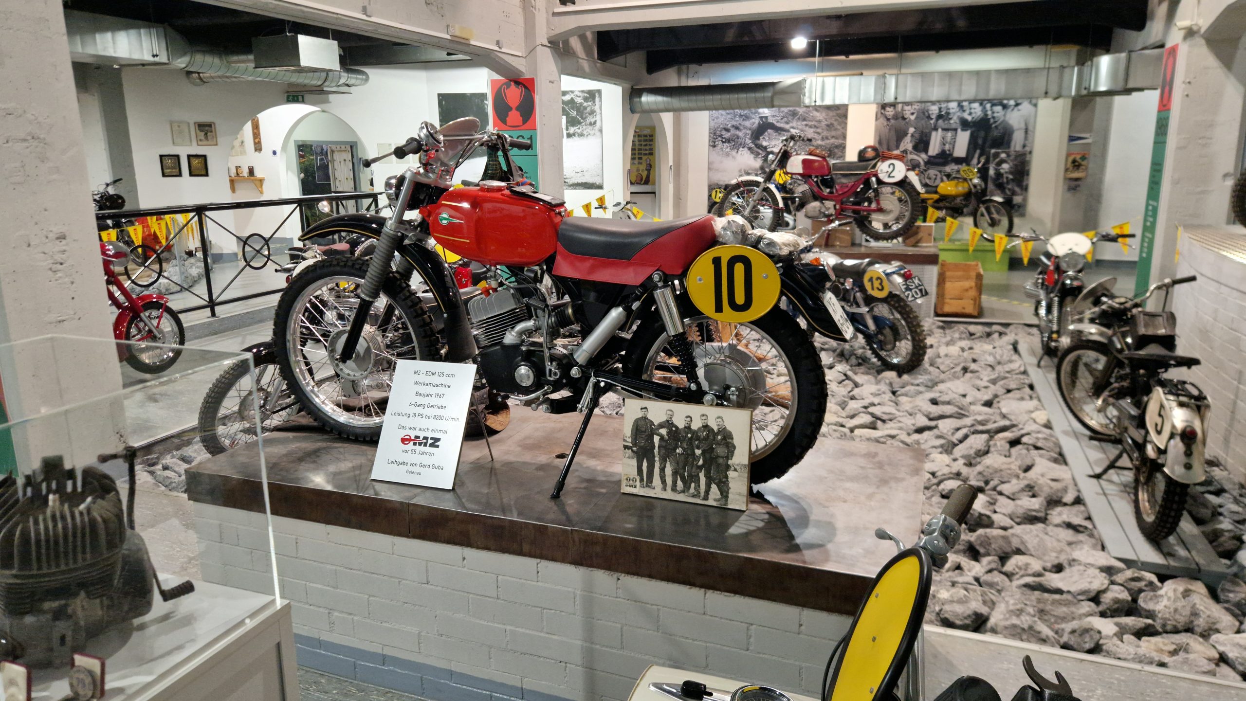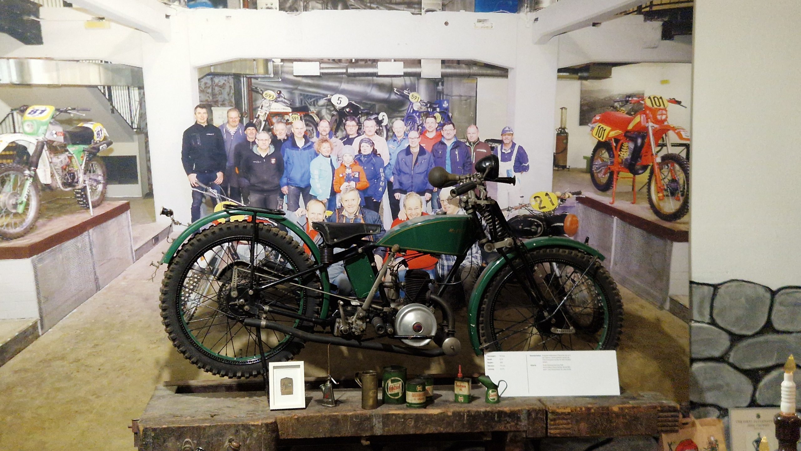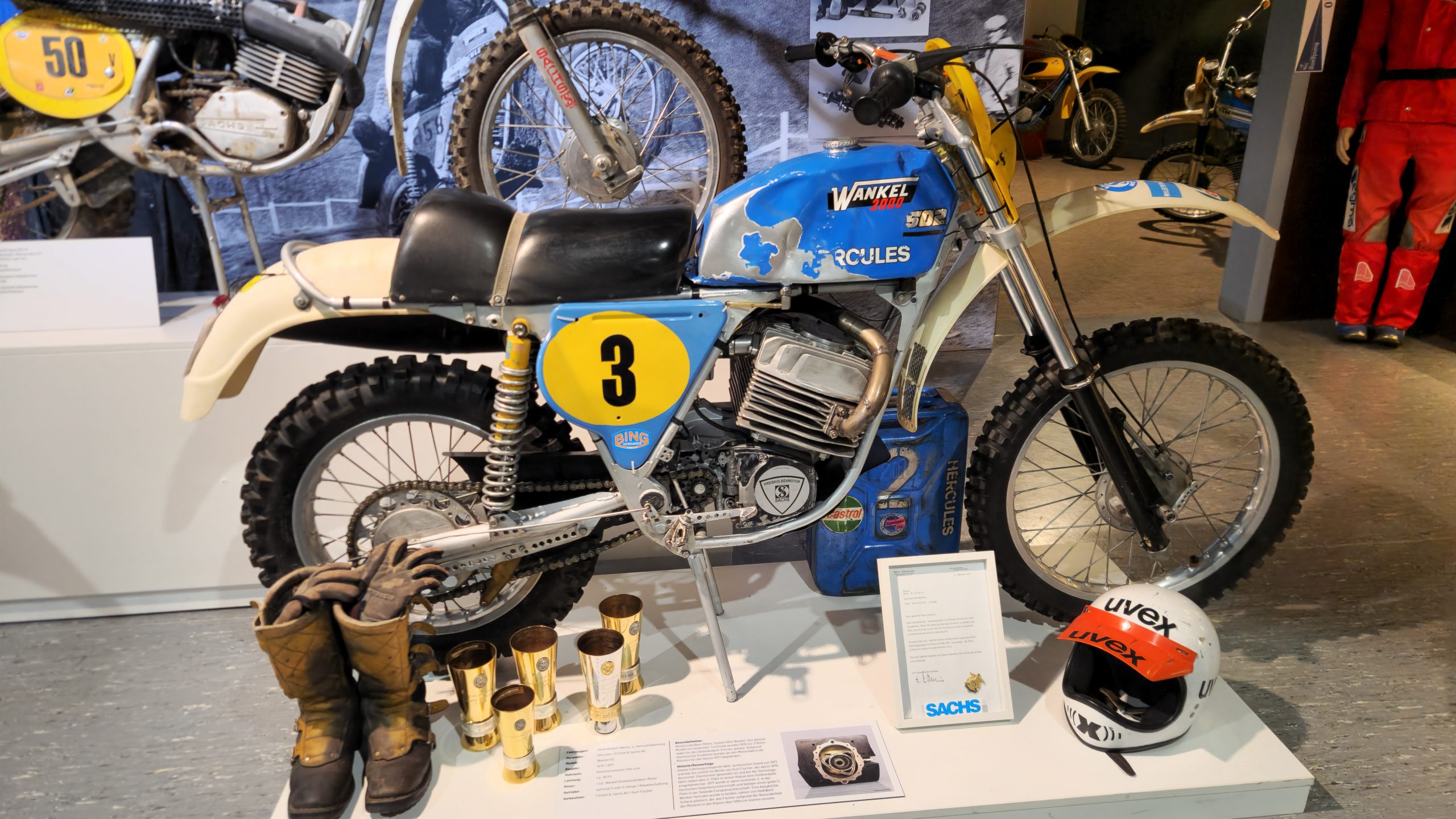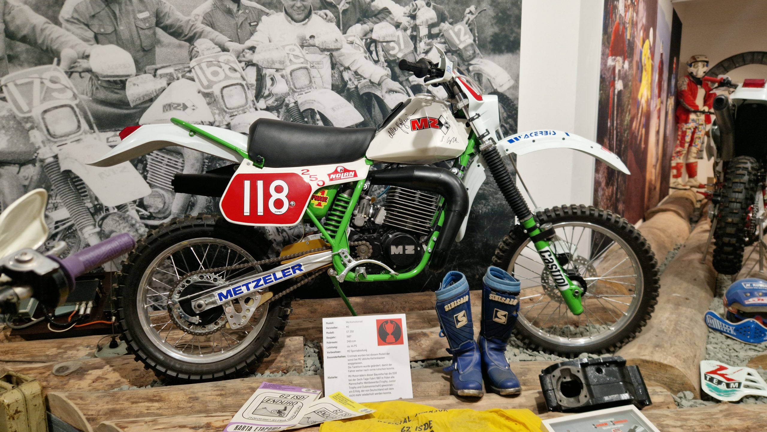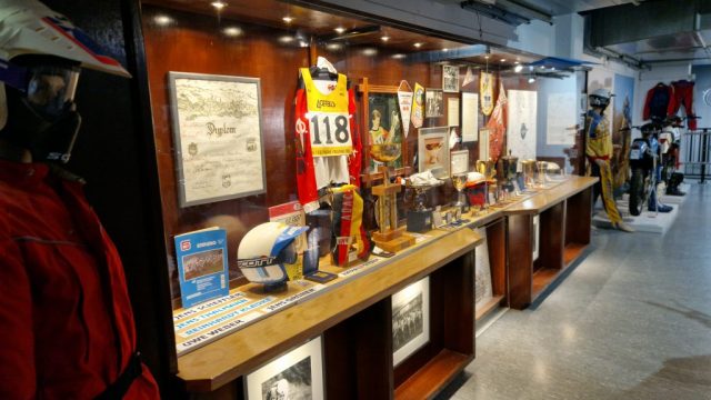 Dazu gibt es eine Menge Hintergrundinformationen und zu den jeweiligen Bikes oft noch die passenden Trikots, Helme, Stiefel sowie Pokale und Medaillen der jeweiligen Fahrer.
