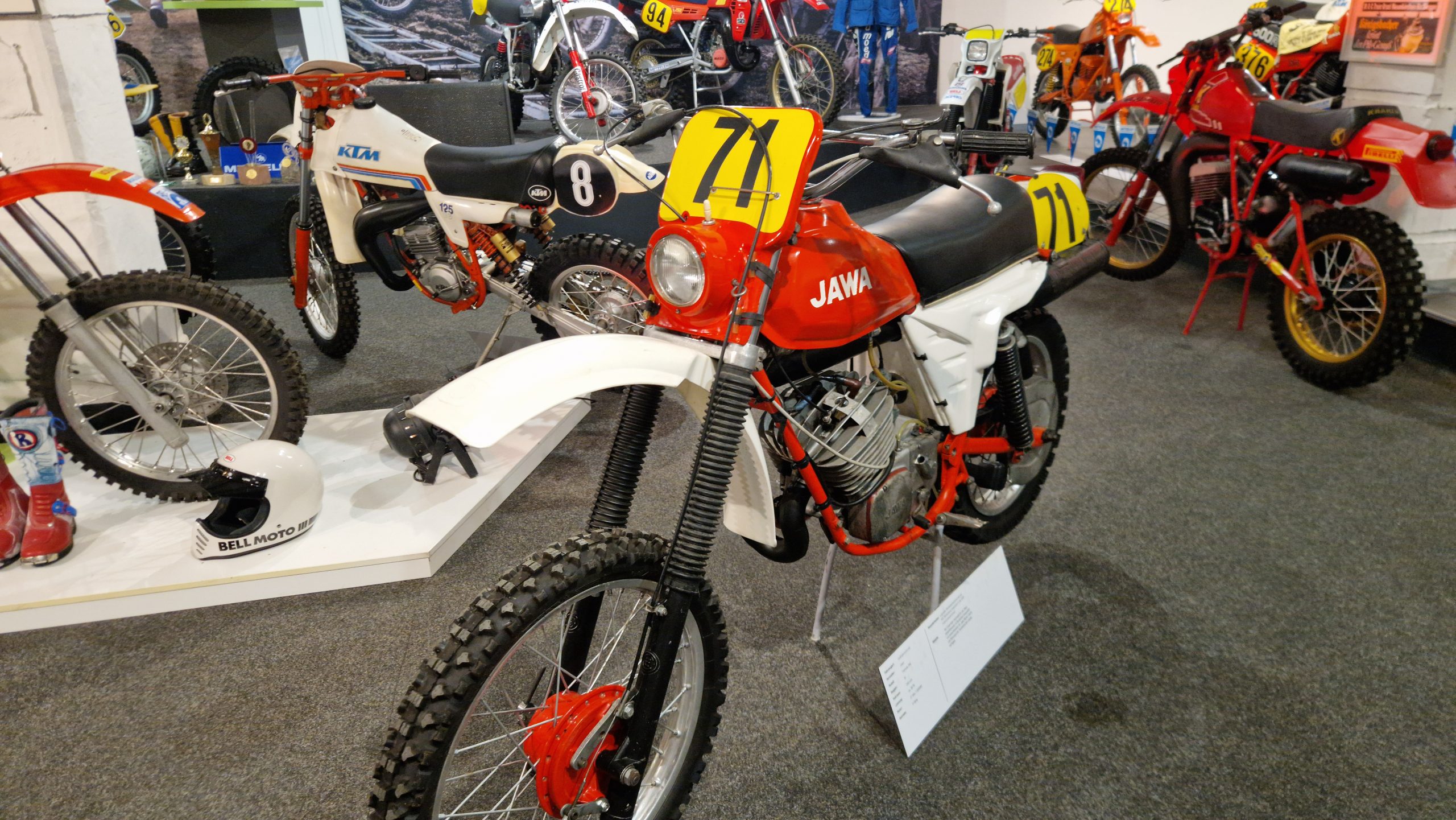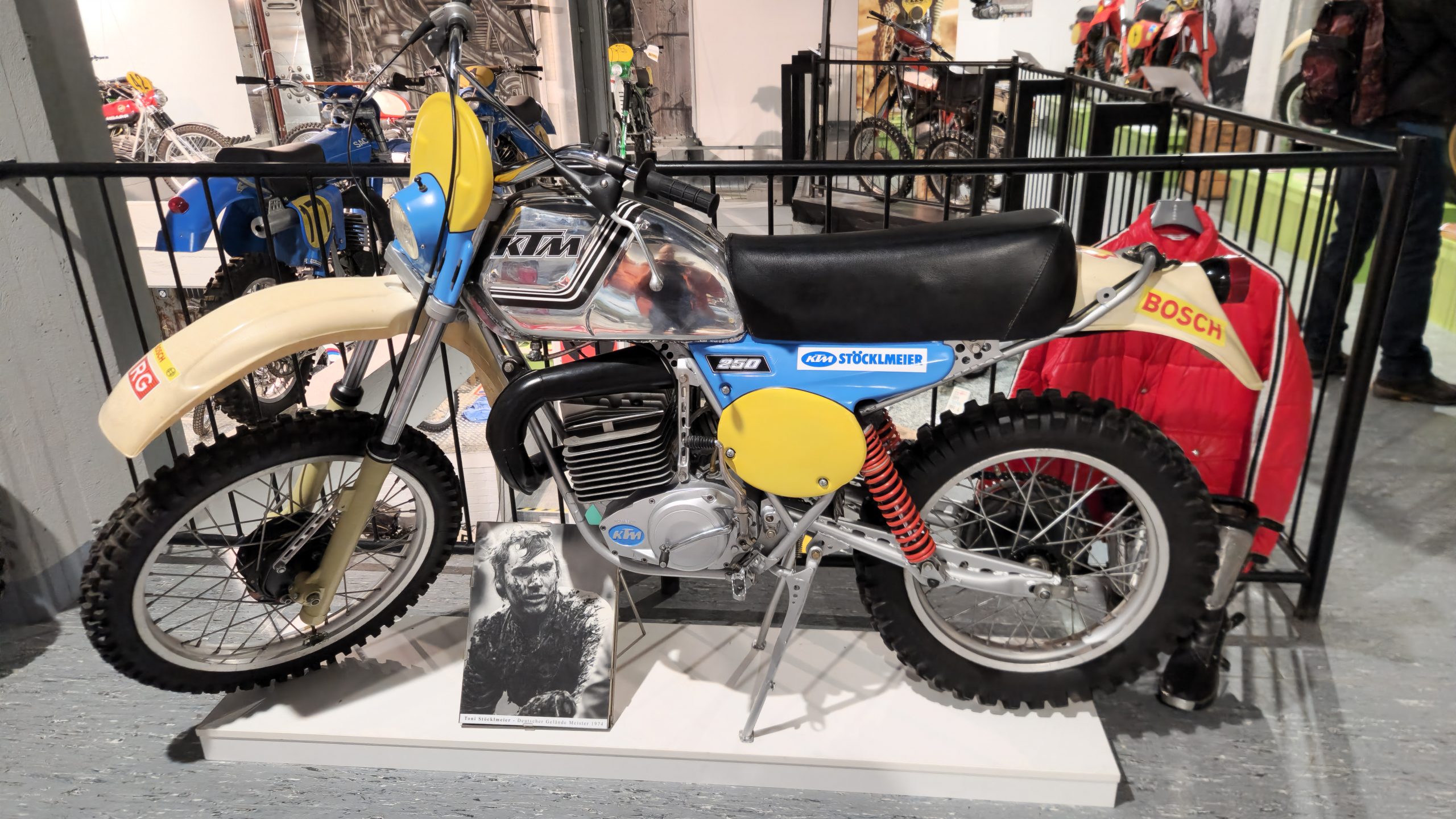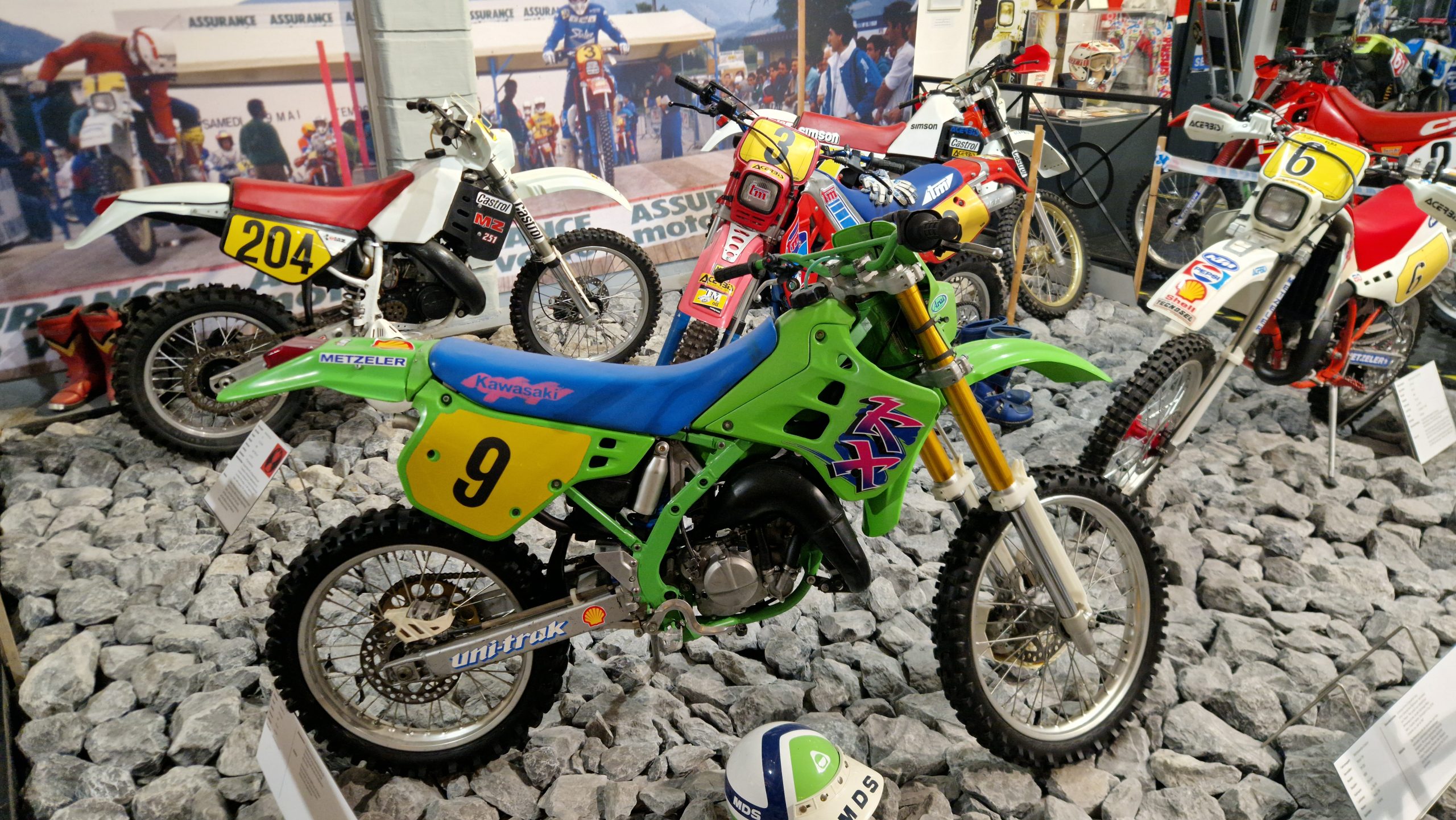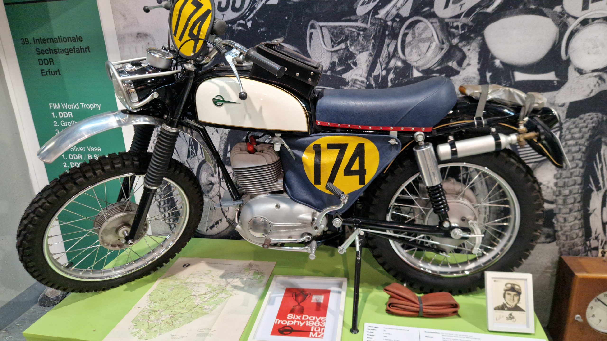 Dazu gibt es eine Menge Hintergrundinformationen und zu den jeweiligen Bikes oft noch die passenden Trikots, Helme, Stiefel sowie Pokale und Medaillen der jeweiligen Fahrer.